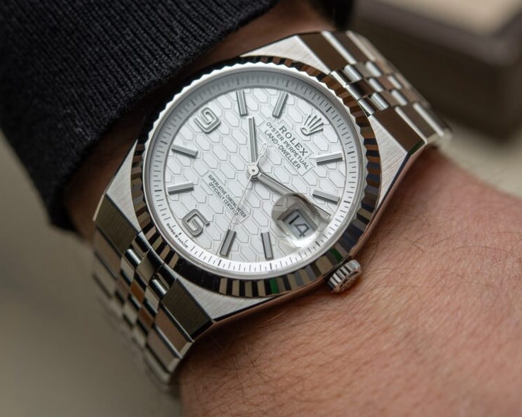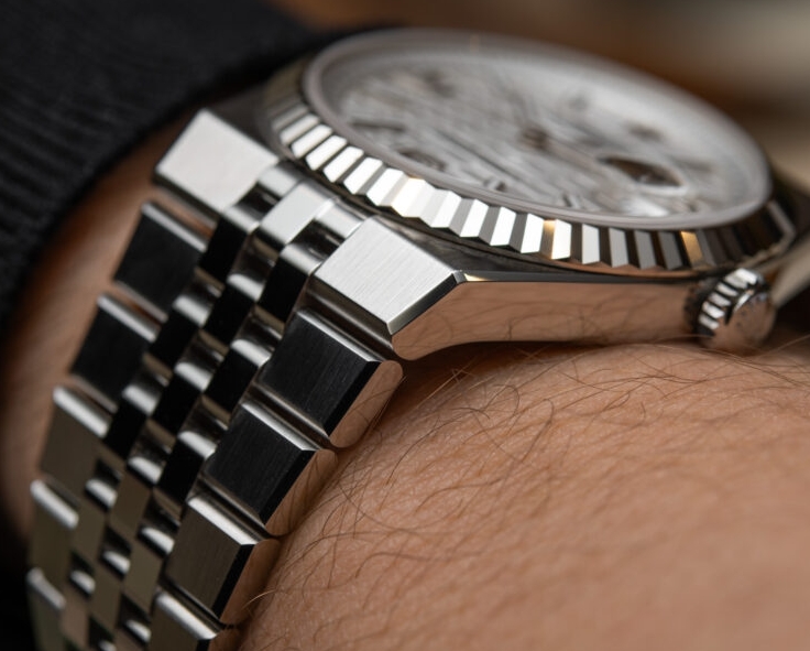 Now, the exterior. The Rolex Land-Dweller watches have an integrated bracelet design. This means that the bracelet joins the case not with a traditional and wide end-link but rather a very narrow one to make the flow between the steeply angled lugs (another trait of integrated design) and the bracelet that much more continuous. This has been all the rage in the last five or so years, although Rolex is keen to point out that it has had a similar design not in the ’70s, but in 1969 with its first quartz wristwatch… And that was three years before the debut of the Audemars Piguet Royal Oak, the high quality fake Rolex watches with which many automatically associate this trend and design.